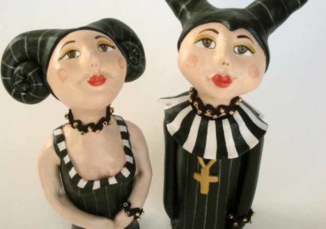The gothic twins Edwin and Lilith are born. Adorned with some vintage rick rack trim and seed bead jewellery, these two stand as a pair at about 15cm tall. Spotted on my workbench by a friend who was getting married – I am commissioned to produce a pair for her wedding cake. Wedding cake toppers…