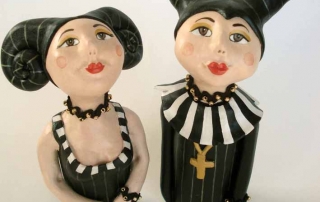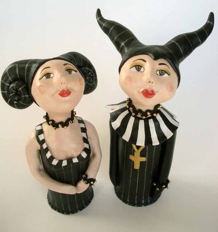 The gothic twins Edwin and Lilith are born. Adorned with some vintage rick rack trim and seed bead jewellery, these two stand as a pair at about 15cm tall. Spotted on my workbench by a friend who was getting married – I am commissioned to produce a pair for her wedding cake. Wedding cake toppers that are caricatures of the Bride and Groom, what a great concept!